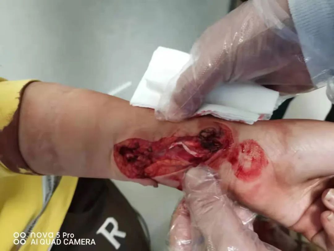 4月19日中午,急促的電話鈴聲響徹在急診室,電話的另一端傳來急切的語氣:一位12歲的小女孩,不小心被玻璃劃破了手臂,傷口深至肌腱,需要馬上進(jìn)行診治!急診救護(hù)車第一時(shí)間前往患者家中并同時(shí)聯(lián)系了骨科主任,骨科呂國(guó)福主任接到電話后,立即帶領(lǐng)骨科團(tuán)隊(duì),嚴(yán)格按照院感防控措施做好防護(hù),到達(dá)急診做好接診準(zhǔn)備。