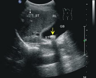這位先生姓錢,自訴飲酒后出現胸骨后疼痛4小時,呈壓榨性,持續(xù)不緩解,伴大汗、面色蒼白、惡心、欲吐,既往無高血壓、糖尿病、冠心病病史,吸煙史30年,偶有飲酒,入院時查體血壓為120/80mmHg,心率:98次/分,節(jié)律規(guī)整,未聞及明顯雜音。心電圖:竇性心律,心率98次/分,II、III、aVF導聯病理性Q波,ST段下移,不正常心電圖。不除外急性心肌梗死。急檢心肌酶及超敏肌鈣蛋白、淀粉酶,結果回報心肌酶、超敏肌鈣蛋白無明顯改變。疼痛時復查心電圖較前無變。胸痛癥狀仍持續(xù)不緩解,給予曲馬多止痛不改善。請示李桂武主任醫(yī)師,主任給予詳細詢問病史、癥狀及查體,患者膽囊區(qū)有壓痛無反跳痛,考慮患者可能存在膽囊性疾病,不排除腎結石,指示:急檢肝膽胰脾彩超及泌尿系彩超。我急忙陪著患者及家屬去門診彩超室做肝膽胰脾及泌尿系彩超。結果如下圖。提示膽囊結石。