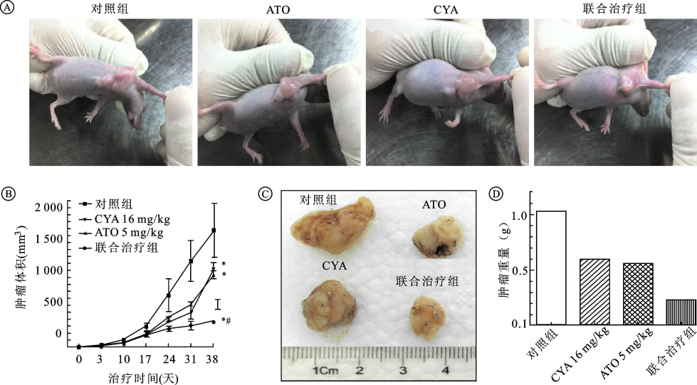 A :移植瘤位置;B :移植瘤體積折線圖;C :移植瘤大體觀;D :移植瘤質(zhì)量柱狀圖。與對照組比較,* P < 0.05 ;與單劑量藥物組比較,# P< 0.05。