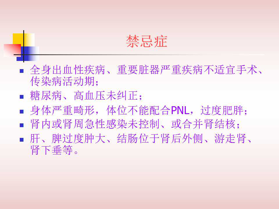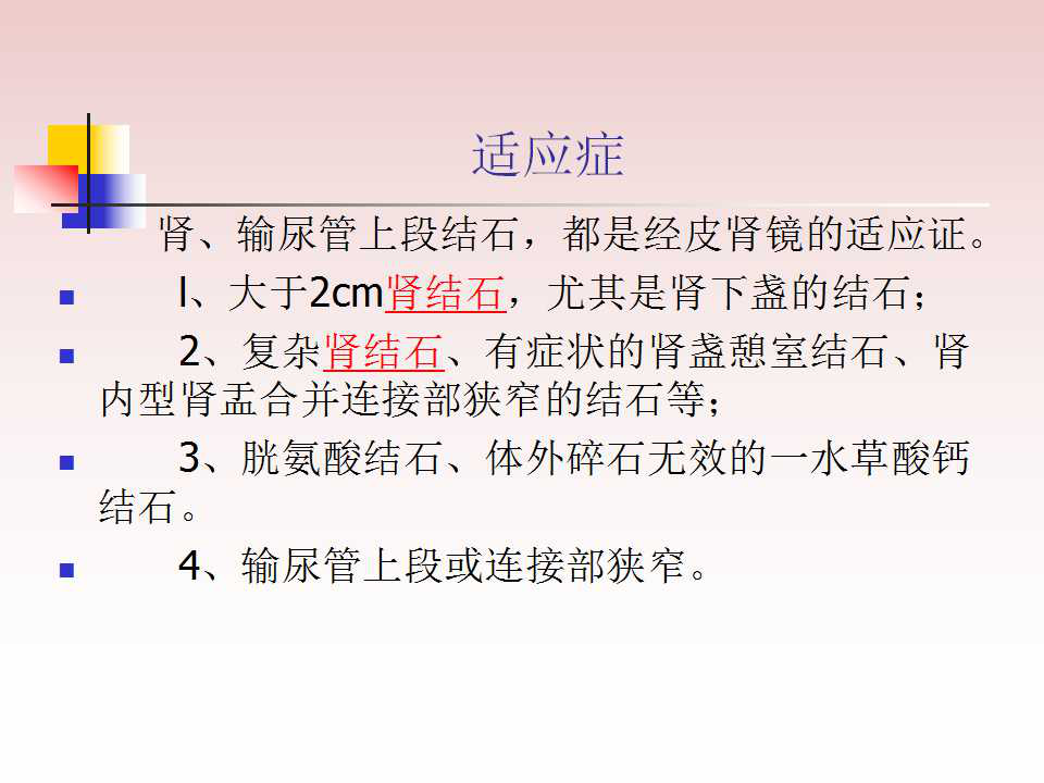 經(jīng)皮腎鏡取石術(shù)的優(yōu)勢(shì): ①與開放手術(shù)相比,經(jīng)皮腎鏡取石術(shù)具有損傷小、痛苦輕、取石徹底、恢復(fù)快等優(yōu)點(diǎn)。腰部的切口通常小于1cm,因?yàn)椴磺虚_肌肉,因此不但不影響美觀,而且手術(shù)后對(duì)勞動(dòng)力幾乎沒有影響。②與腹腔鏡取石相比,經(jīng)皮腎鏡取石術(shù)對(duì)腎臟及周圍的結(jié)構(gòu)影響小,不影響以后的各種腎臟手術(shù)。③與體外碎石相比,它的治療周期短、效果立竿見影,對(duì)腎功能的影響也較小。其禁忌癥為:全身出血性疾病、重要臟器嚴(yán)重疾病不適宜手術(shù)、傳染病活動(dòng)期;糖尿病、高血壓未糾正;身體嚴(yán)重畸形,體位不能配合PNL,過(guò)度肥胖;腎內(nèi)或腎周急性感染未控制、或合并腎結(jié)核;肝、脾過(guò)度腫大、結(jié)腸位于腎后外側(cè)、游走腎、腎下垂等。