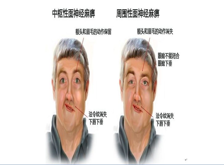 中樞性面癱常為病變對側(cè)顏面下部肌肉出現(xiàn)麻痹;周圍性面癱表現(xiàn)為病灶同側(cè)全部面部肌肉癱瘓。中樞性面癱出現(xiàn)時(shí),眼瞼以上面部表情肌未出現(xiàn)癱瘓,故患者閉眼、皺眉、揚(yáng)眉動作均正常,且兩側(cè)面額肌深度、眉毛高度、瞼裂大小均無異常出現(xiàn)。病變對側(cè)眼瞼以下的表情肌出現(xiàn)癱瘓。周圍性面癱因病變同側(cè)所有面肌出現(xiàn)癱瘓,患者不能進(jìn)行皺眉、皺額、閉眼、露齒、鼓腮等動作。病伴有鼻唇溝變淺及口角下垂。