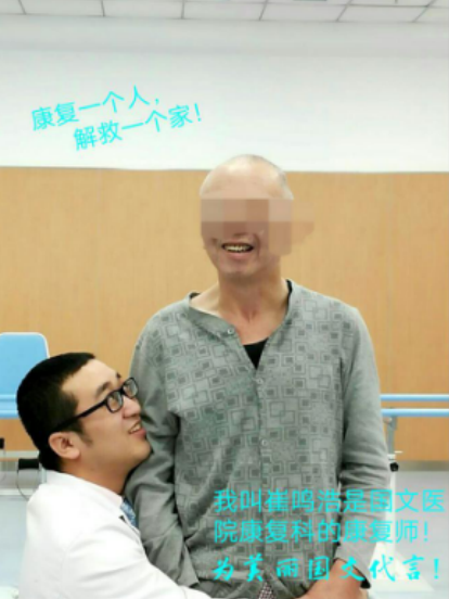 我叫崔鳴浩,在國(guó)文醫(yī)院康復(fù)科任職。2016年3月29日一位患者的妻子和兒子帶著患者找到了我,患者坐著輪椅,右側(cè)肢體偏癱,僵硬,言語(yǔ)模糊不能與人溝通。患者兒子說(shuō)“我們是通過親戚介紹找到的你希望你給我爸爸做康復(fù)。”我說(shuō)“可以”。于是我給患者做了簡(jiǎn)單的查體?;颊吆苤貛缀鯇儆诎c瘓,不能獨(dú)立坐,右側(cè)肢體肌張力過高,關(guān)節(jié)僵硬完全不能活動(dòng)。我和家屬說(shuō)“你得做個(gè)長(zhǎng)期治療的打算,他可以行走但是時(shí)間會(huì)很長(zhǎng)有可能會(huì)是一年兩年或是更長(zhǎng)時(shí)間?!眱鹤营q豫了一會(huì)說(shuō)“我爸我就交給你了,我和我媽媽相信你?!?016年3月29號(hào)開始我給患者做康復(fù)治療,一年時(shí)間過去了經(jīng)過不懈的努力患者從不能起坐直到現(xiàn)在可以扶杠可以行走。一名醫(yī)生不僅僅是就死還可以扶傷,我作為一名康復(fù)師患者生命體征穩(wěn)定以后,后天的康復(fù)治療是我們的職責(zé),患者信任你他會(huì)無(wú)話不談。他會(huì)把你當(dāng)成救世主當(dāng)成他的救命稻草。