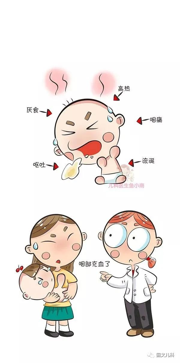突起發(fā)熱無前驅(qū)癥狀,體溫多在38.5-40℃之間,熱程一般2-4天,年長兒可伴有乏力、頭痛、肌痛等。嬰幼兒可有納差、惡心、嘔吐、腹瀉等癥狀。咽部充血,可見灰白色皰疹,周圍紅暈,可累及軟腭、扁桃體、懸雍垂,但一般不累及齒齦及頰粘膜。全身及咽部癥狀一般需4-6天自愈,少數(shù)需2周,少有并發(fā)癥。?