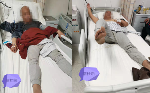 在溶栓過(guò)程中,每15分鐘監(jiān)測(cè)一次血壓,隨時(shí)觀察口腔及皮膚黏膜有無(wú)出血,且密切觀察病情變化,高大叔肌力逐漸好轉(zhuǎn),語(yǔ)言功能逐漸恢復(fù)。溶栓后第一天高大叔可在家屬攙扶下進(jìn)行床邊活動(dòng),口齒稍清晰,反應(yīng)和記憶力及邏輯能力正常。溶栓術(shù)后第三天:可自行行走,自行吃飯,生活自理能力明顯改善,治療效果非常顯著。
