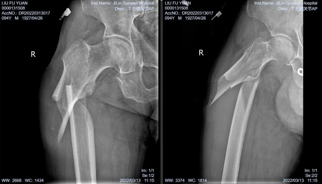 面對(duì)如此高齡患者,為降低手術(shù)難度及麻醉風(fēng)險(xiǎn)。同時(shí)考慮到患者疼痛劇烈,無(wú)法配合腰麻,需要全麻。吉林國(guó)文醫(yī)院的專家團(tuán)隊(duì)們決定采取“有限切開,髓內(nèi)釘內(nèi)固定術(shù)”,該手術(shù)創(chuàng)傷小,風(fēng)險(xiǎn)低,術(shù)后有利于患者恢復(fù)。在麻醉科、心血管內(nèi)科團(tuán)隊(duì)的保駕下,于當(dāng)日夜間緊急為老人家實(shí)施手術(shù),手術(shù)歷時(shí)1個(gè)多小時(shí)。為能及時(shí)應(yīng)對(duì)患者出現(xiàn)術(shù)中血壓波動(dòng)大的風(fēng)險(xiǎn),麻醉科劉桂穎、程志超兩位主任及麻醉科值班醫(yī)生一直陪伴在老人身邊,監(jiān)護(hù)手術(shù)整個(gè)過(guò)程。
