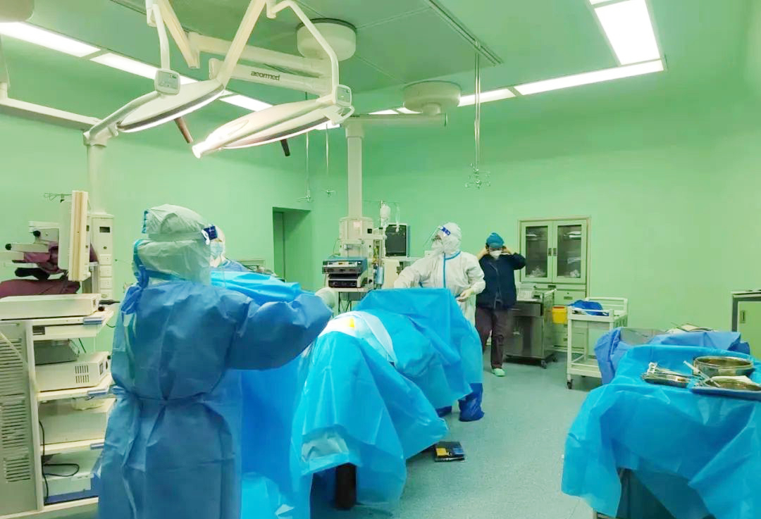 患者雖然做了核酸檢測,但病情不允許等待檢測結(jié)果,否則病情加重,加大危及生命風(fēng)險(xiǎn)。按照醫(yī)院疫情期間工作流程,所經(jīng)之處嚴(yán)密消毒,乘專用電梯送到手術(shù)室專用手術(shù)間,在手術(shù)人員都做好防護(hù)的前提下,進(jìn)行了腹腔鏡下探查術(shù),術(shù)中發(fā)現(xiàn)左側(cè)輸卵管壺腹部妊娠破裂,腹腔積血約1100ml,做了左側(cè)輸卵管切除術(shù),術(shù)中一度出現(xiàn)休克狀態(tài),輸入同型血400ml。目前患者病情穩(wěn)定,恢復(fù)良好。