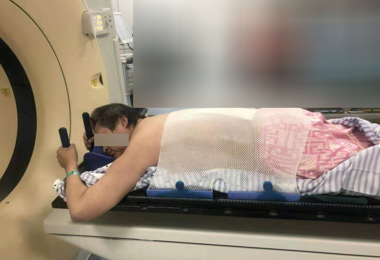 第一步,扣膜。膜具的使用,目的是保證每次放療的體位重復(fù)性,使每次治療靶區(qū)的放射線劑量處于均衡狀態(tài)。醫(yī)生需要根據(jù)患者治療的食管癌部位選擇用膜的具體部位,如頸部存在較高的轉(zhuǎn)移灶,有時需將頸部甚至頭部同時固定。如腹腔存在淋巴結(jié)轉(zhuǎn)移,膜具需要適當(dāng)向下覆蓋。