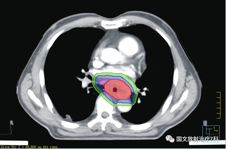 第二步,CT模擬定位。在扣膜狀態(tài)下進(jìn)行CT平掃+增強(qiáng)掃描,獲取影像后放療科醫(yī)生就可以在電腦上借助軟件進(jìn)行靶區(qū)的勾畫了。