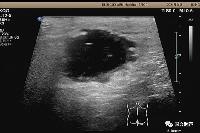 肛周:7點(diǎn)鐘方向皮下脂肪層內(nèi)探及不均質(zhì)低無回聲包塊,范圍約4.6*3.0cm,較淺處距體表約0.6cm,邊界不清,周圍軟組織回聲增強(qiáng),CDFI:周邊血流信號豐富,輕加壓探頭有涌動感,如下圖: