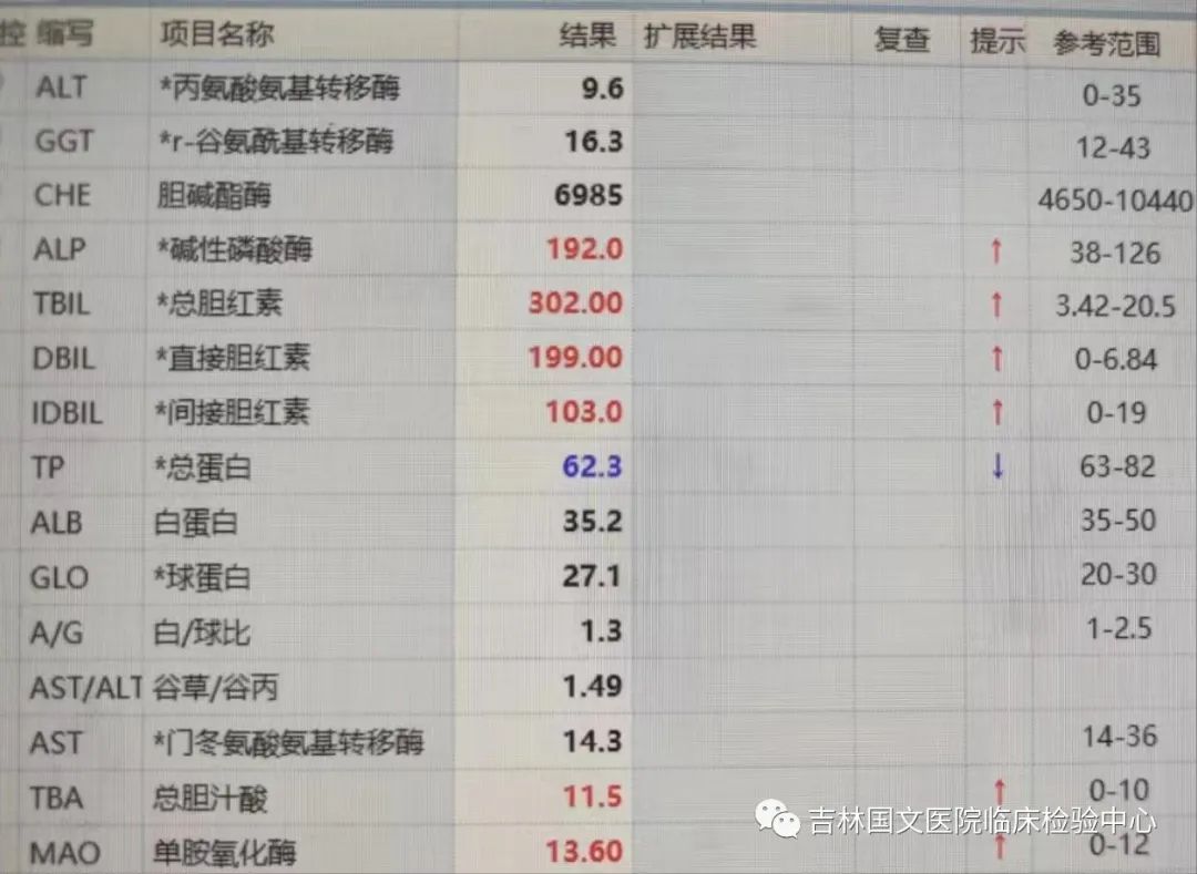 如圖所示的化驗單中,其總膽紅素(TBIL)出現(xiàn)增高,可以考慮黃疸。