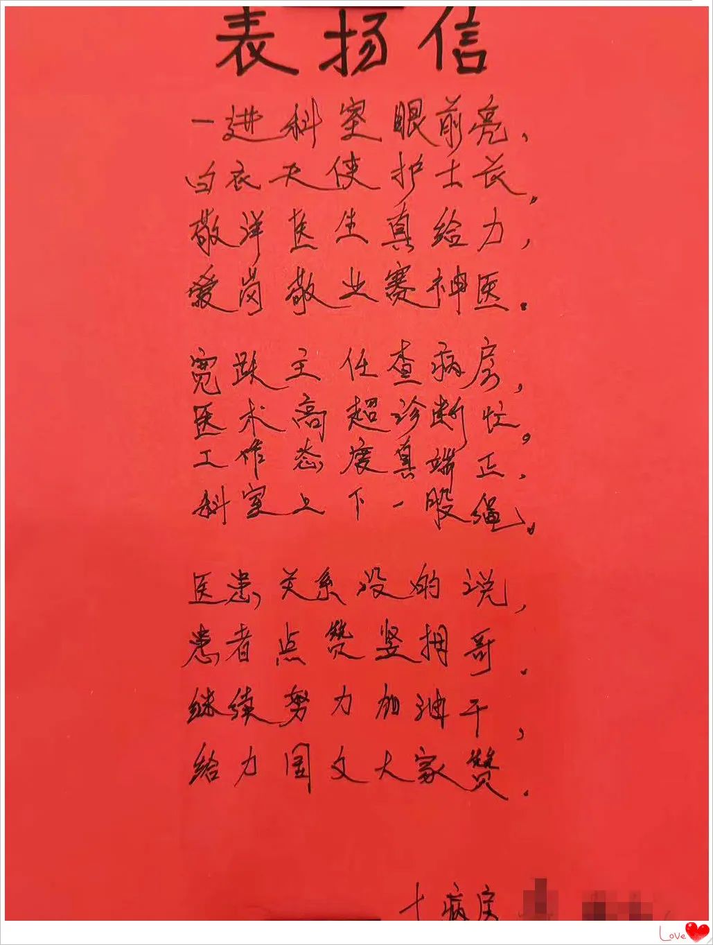 “我是宋主任多年的老患者”“這次在國文中醫(yī)科住院”“醫(yī)護們的服務讓我感到很暖心”“宋主任的頭針技術更是沒得說”“讓我身上這些癥狀得到明顯改善”“我對整個治療過程很滿意”即將出院的田先生特別激動地說,為表對中醫(yī)科宋寬躍主任團隊的感謝,他特別寫了一首感謝詩贈與中醫(yī)科團隊,小愛匯聚大愛,對患者來說,點滴關懷,溫暖珍貴,國文醫(yī)院中醫(yī)科守正創(chuàng)新,始終堅持一切以病人為中心。懷揣對生命的敬畏,在人文關懷和服務態(tài)度上,“急患者之所急,想患者之所想”,時刻為百姓生命健康保駕護航。