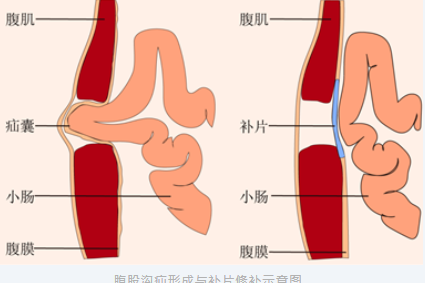 腹股溝疝形成與補片修補示意圖