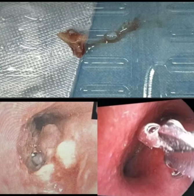 近日,一名9歲男孩魚骨誤入氣管,當(dāng)時(shí)未在意,超過24小時(shí)后出現(xiàn)咳嗽咳痰癥狀,縣級(jí)醫(yī)院無法取出,前來長(zhǎng)春國文醫(yī)院就診。急診麻醉下,呼吸內(nèi)科劉曉峰主任聯(lián)合麻醉醫(yī)師給予全麻內(nèi)鏡下明確魚骨位置,鏡下見魚骨已經(jīng)與支氣管內(nèi)膜侵襲,形成感染,給予嘗試活檢鉗探取,最終取出魚骨。