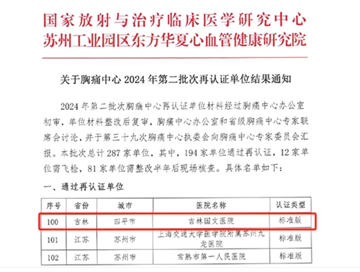 4月3日,吉林國(guó)文醫(yī)院胸痛中心以全優(yōu)成績(jī)通過(guò)國(guó)家級(jí)標(biāo)準(zhǔn)版“再認(rèn)證”,成為中國(guó)胸痛中心總部認(rèn)證的全國(guó)標(biāo)桿單位。這是該院繼2021年首次獲評(píng)后,第二次通過(guò)這一代表我國(guó)急性胸痛救治最高水平的國(guó)家級(jí)評(píng)審,標(biāo)志著其救治體系、質(zhì)控能力和區(qū)域協(xié)作水平持續(xù)穩(wěn)居“國(guó)家隊(duì)”行列。