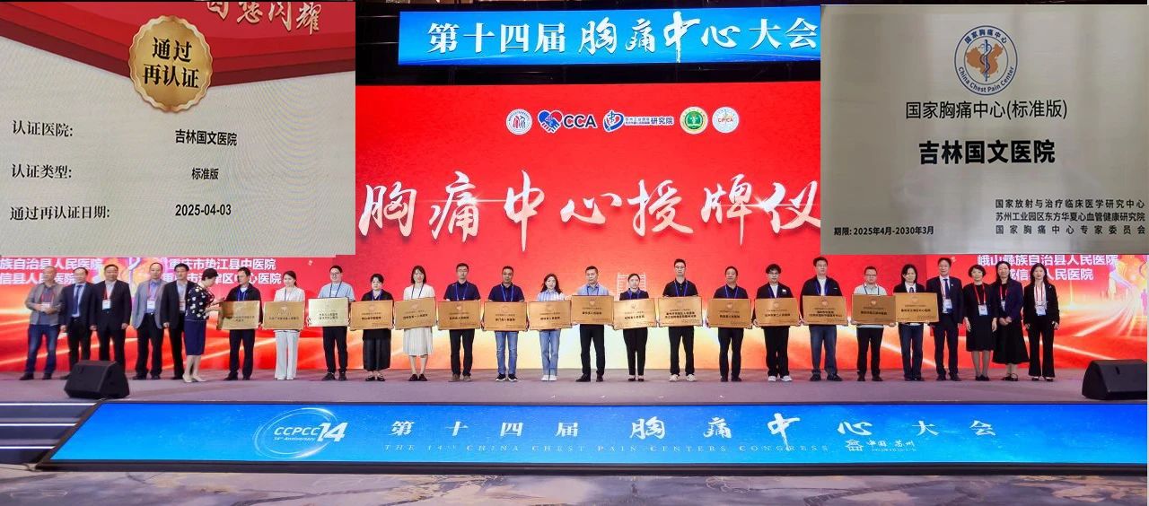 2025年4月26日,在第十四次胸痛中心大會(huì)上,經(jīng)國(guó)家胸痛中心委員會(huì)投票,吉林國(guó)文醫(yī)院胸痛中心通過(guò)再認(rèn)證,獲得“國(guó)家胸痛中心(標(biāo)準(zhǔn)版)”的授牌,這標(biāo)志著國(guó)文醫(yī)院胸痛中心救治流程、技術(shù)和質(zhì)量管理持續(xù)保持國(guó)家標(biāo)準(zhǔn)化水平。