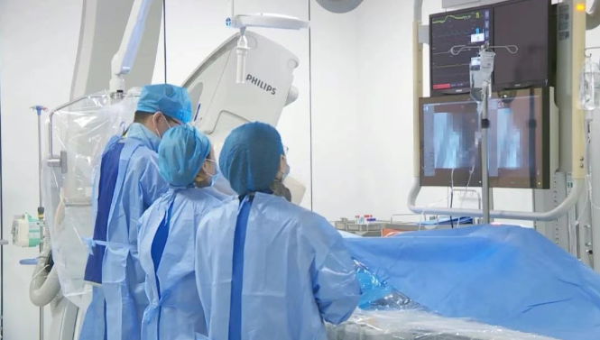 轉(zhuǎn)至我院后,腎病中毒科團隊立即為孫先生啟動規(guī)律透析及CRRT(連續(xù)性腎臟替代治療),穩(wěn)定內(nèi)環(huán)境的同時減輕心臟負荷。經(jīng)過系統(tǒng)治療,孫先生的心功能顯著改善,EF值提升至44%,為后續(xù)手術(shù)贏得機會。 面對患者復(fù)雜的血管病變,胸痛中心團隊迎難而上。由于常規(guī)橈動脈穿刺路徑閉塞,胸痛中心團隊果斷選擇右側(cè)肱動脈入路,成功完成冠脈造影。結(jié)果顯示:回旋支近段99%狹窄、前降支慢性閉塞、右冠中段重度狹窄——典型的“三支病變”,隨時可能引發(fā)猝死。 開通血管,植入支架重啟“心”動力