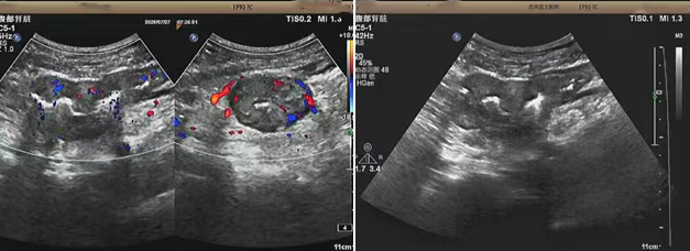 轉(zhuǎn)診至我院后,腸鏡檢查有了重要發(fā)現(xiàn) —— 王女士腸道內(nèi)存在不規(guī)則腫物,腫物表面出現(xiàn)潰爛出血的情況,還導(dǎo)致了腸腔狹窄。這一發(fā)現(xiàn)讓病情的排查有了方向,隨后超聲科接診,立即啟動(dòng)重點(diǎn)探查,力求更精準(zhǔn)地了解病變情況。