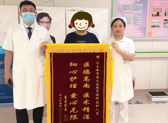 近日,國(guó)文醫(yī)院肝膽胰胃腸外科成功為一名79歲高齡的胃惡性腫瘤患者實(shí)施了高難度的腹腔鏡下根治性全胃切除術(shù)。出院前夕,患者家屬將一面承載著無(wú)盡感激的錦旗送到了科室,衷心感謝王得勝主任團(tuán)隊(duì)精湛的醫(yī)術(shù)和護(hù)理人員悉心的照料。