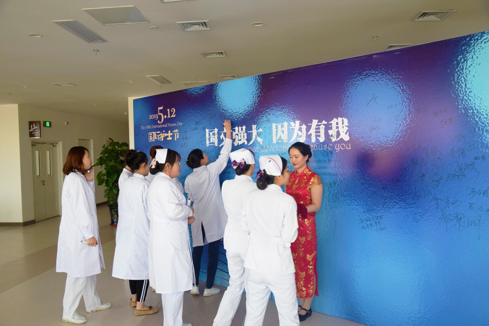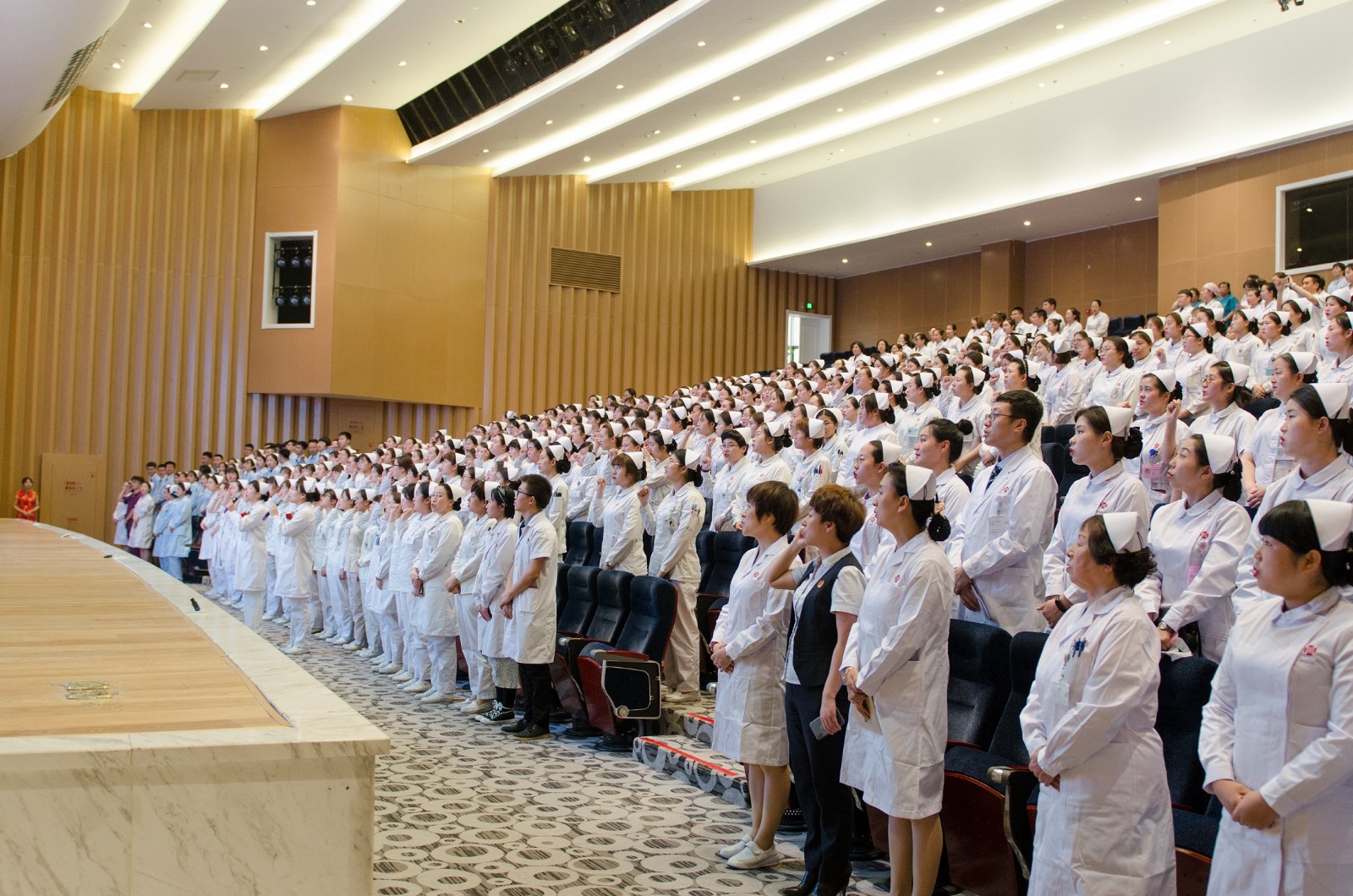 下午13時(shí)許,吉林國文醫(yī)院上千名醫(yī)護(hù)人員紛紛在“國文強(qiáng)大因?yàn)橛形摇钡拇笮秃灻迳虾灻?3時(shí)30分許,該院首屆護(hù)理品管圈大賽拉開帷幕。