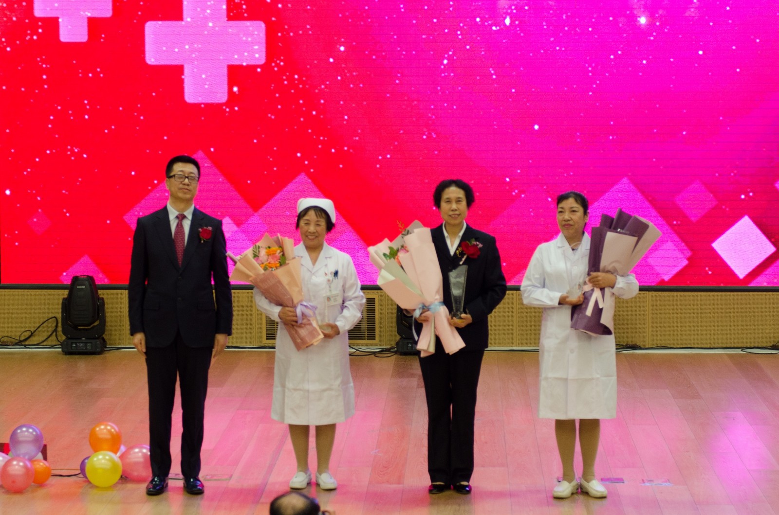 15時(shí)30分許,該院院長為奉獻(xiàn)給護(hù)理事業(yè)30余年的邵玉琴副院長、姜桂榮護(hù)士長、關(guān)家媛老師頒獎(jiǎng)。