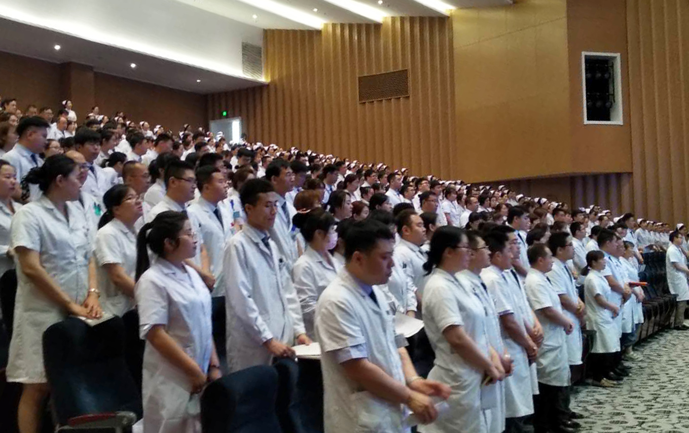 按照會(huì)議議程,首先全體參會(huì)人員起立背誦《大醫(yī)精誠》,聲音洪亮、飽富熱情,彰顯了醫(yī)師職業(yè)的神圣感和使命感。